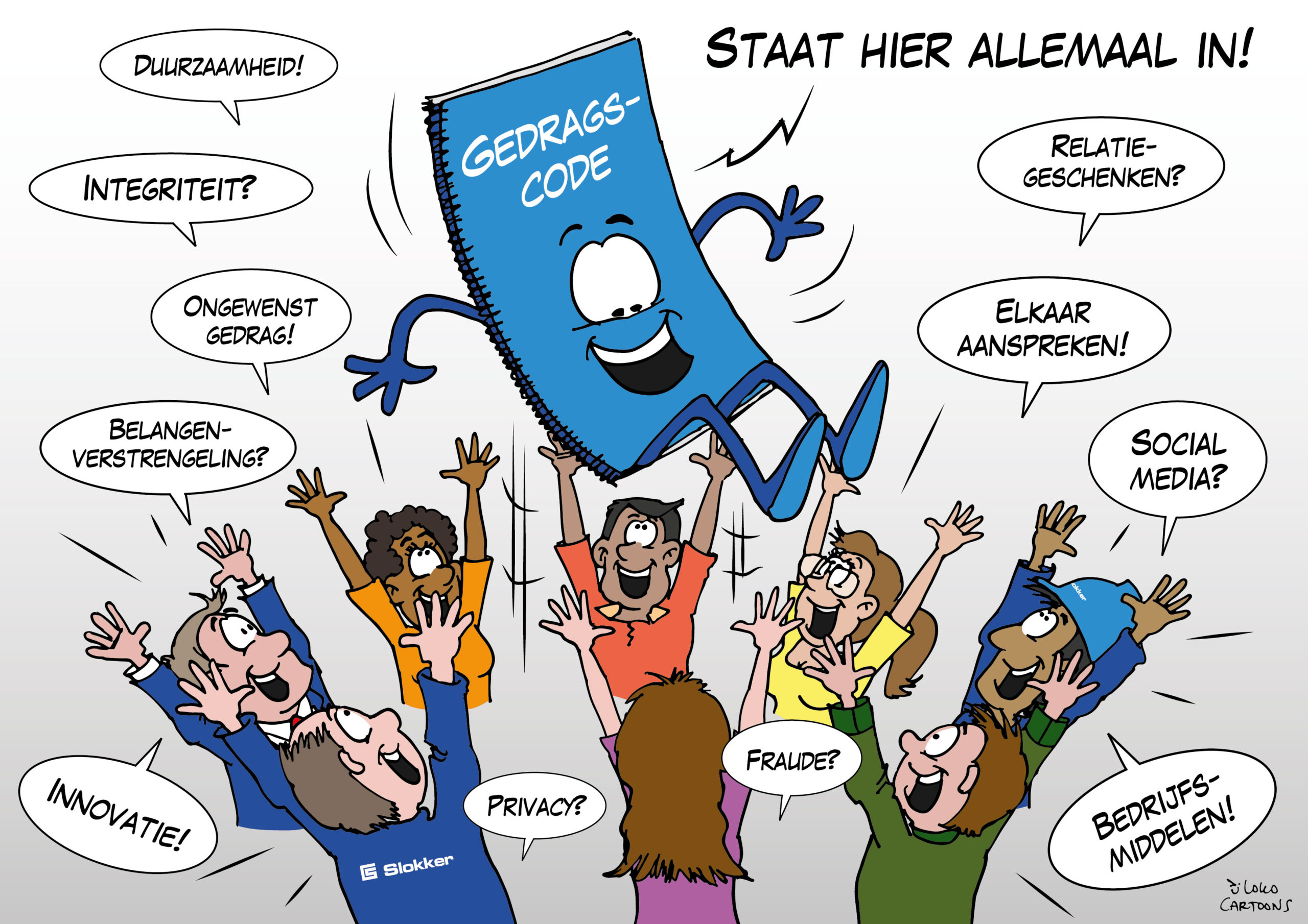 Naleving en beleid | Deze gedragscode beschrijft de minimale standaarden die gelden voor iedere medewerker, ongeacht de positie binnen Slokker. Maar een gedragscode kan nooit alle situaties omvatten. Blijf dus jouw professionele inzichten en gezond verstand gebruiken. Denk aan jouw eigen geloofwaardigheid en reputatie en de mogelijke gevolgen van jouw handelen of nalaten voor de reputatie van ons bedrijf en onze relaties. Als jij ergens over twijfelt, stel jezelf dan de vraag: ‘Durf ik deze situatie openlijk te bespreken met collega’s? Met leidinggevenden? Met mijn familie en vrienden?’ Overweeg of je het op de voorpagina van een krant zou willen lezen. Zo niet, bespreek jouw twijfels met jouw leidinggevende, de vertrouwenspersoon of de HR manager. Overtredingen van deze gedragscode en/of richtlijnen, handleidingen en overige documenten die voor onze medewerkers gelden, zijn reden voor sancties.